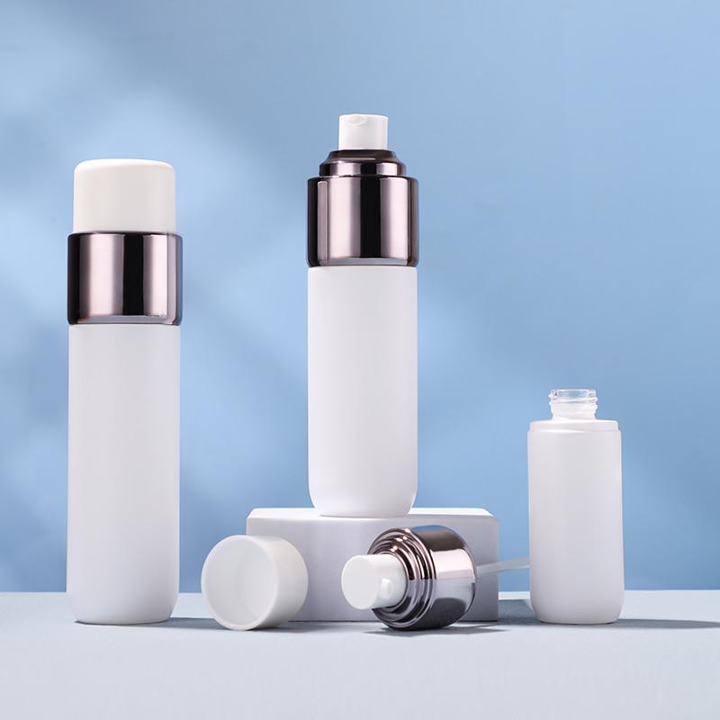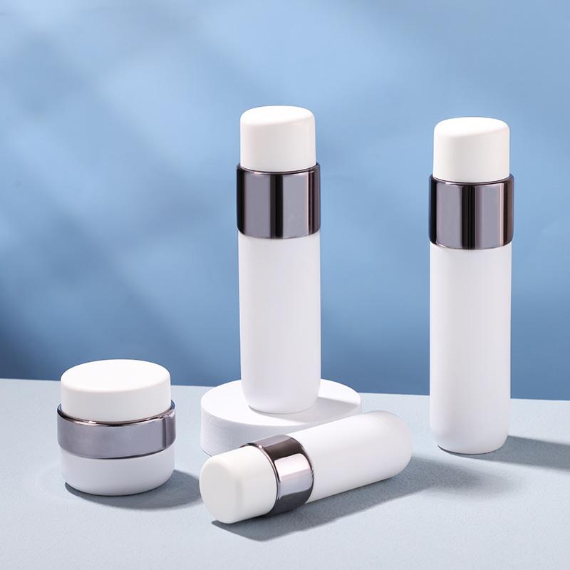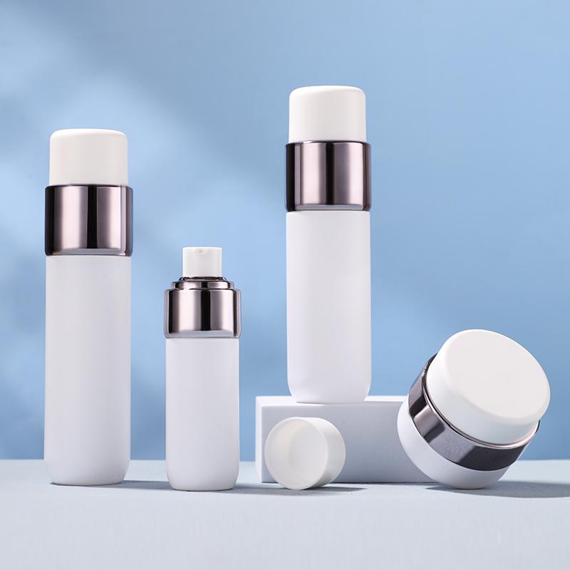 Botella con cuerpo liso, mate y esmerilado, con un diseño sencillo de capas rectas. Ofrecemos 3 tamaños de botella de loción (40 ml, 100 ml, 120 ml) con un tarro de crema a juego de 50 g, un completo paquete de cuidado de la piel.
